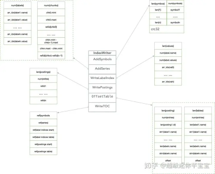 为了节省空间,时间戳范围和数据块的位置信息的存储采用差值编码。 - LabelIndex存储标签键以及每一个标签键对应的所有标签值,当然具体存储的数据也是符号表里面的引用值。