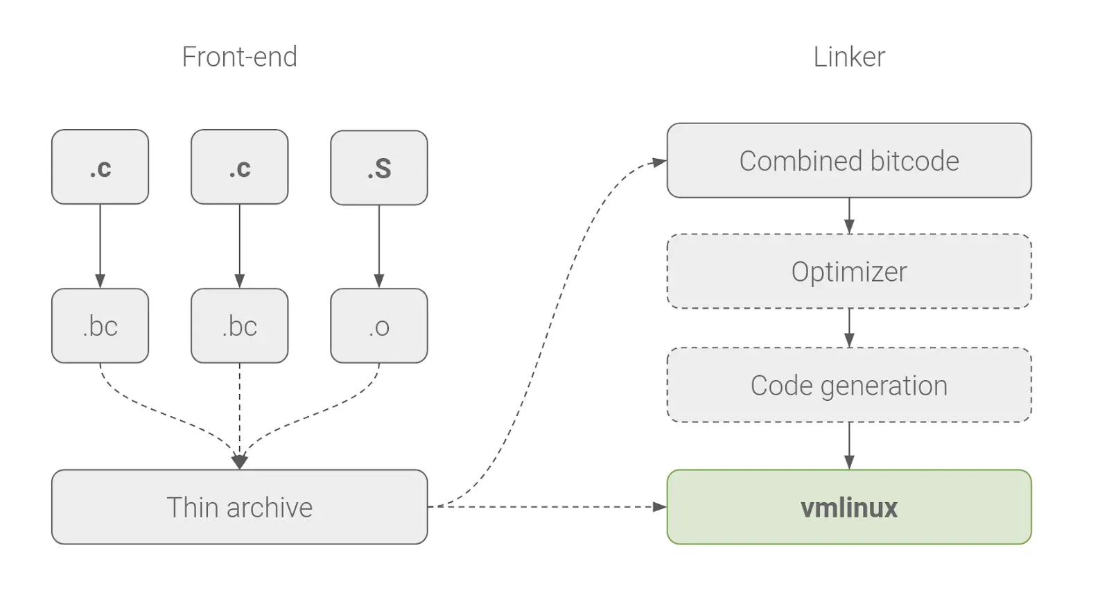 为了确定每个间接分支的所有有效调用目标,编译器需要立即查看所有内核代码。传统上,编译器一次处理单个编译单元(源代文件),并将目标文件合并到链接器。LLVM 的 CFI 要求使用 LTO,其编译器为所有 C 编译单元生成特定于 LLVM 的 bitcode,并且 LTO 感知链接器使用 LLVM 后端来组合 bitcode,并将其编译为本机代码。