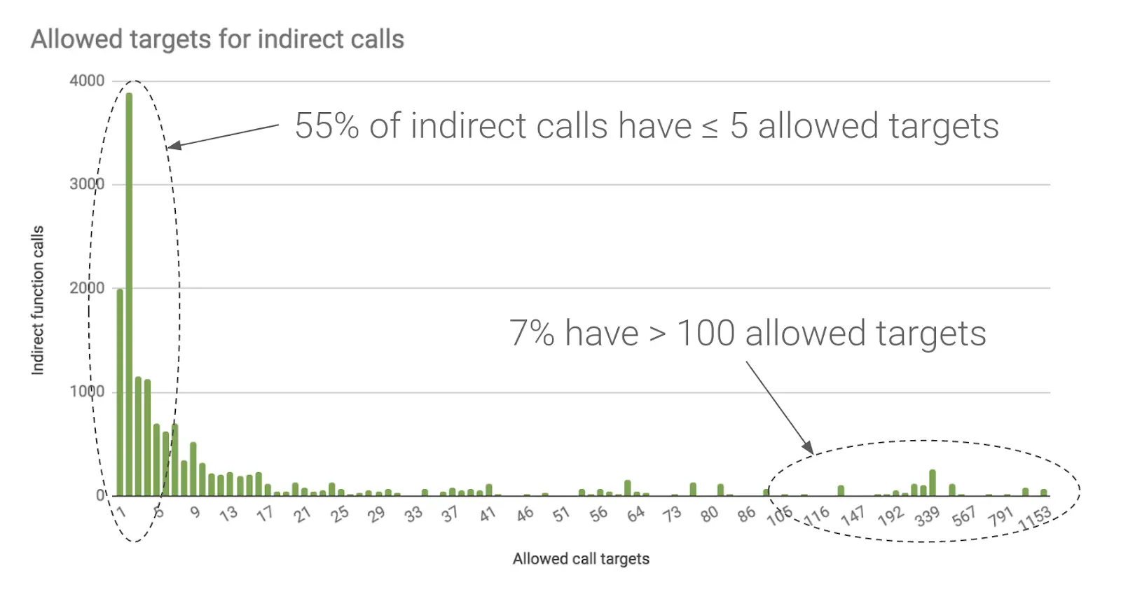 图 1. 在 Android 设备内核中,LLVM 的 CFI 将 55% 的间接调用限制为最多 5 个可能的目标,80% 限制为最多 20 个目标。