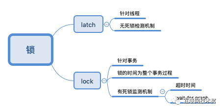 lock是MySQL中在事务中使用的 锁,锁定的对象是事务,来锁定数据库中表、页、行;通常只有在事务commit或者rollback后进行释放。lock是有死锁机制的,当出现死锁时,lock有死锁机制来解决死锁问题:超时时间(参数 innodb_lock_wait_timeout)、 wait-forgraph。