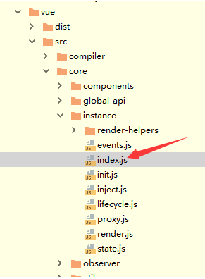 这里的new Vue()就是我们的起点。我们知道new Vue()这样写,Vue就是个构造函数了,那这个构造函数在哪里呢? 我们去node_modules/vue/src/core/instance/index.js里面可以找到,找不到的看截图