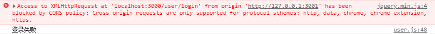 Access to XMLHttpRequest at 'localhost:3000/user/login' from origin 'http://127.0.0.1:3001' has been blocked by CORS policy: Cross origin requests are only supported for protocol schemes: http, data, chrome, chrome-extension, https.