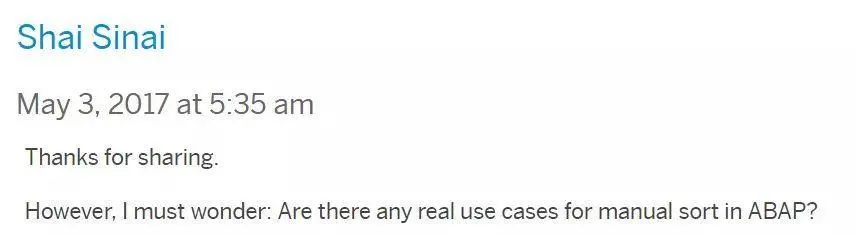 SAP社区上有一位网友Sinai可能觉得我是吃饱了撑着没事干(这倒是事实),毕竟在ABAP里要排序直接使用关键字SORT即可。