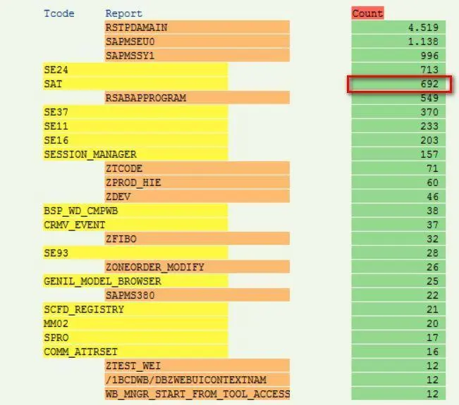 只需写一个简单的ABAP报表,执行就能知道答案。报表的源代码可以通过点击文末"阅读原文"获得。下图是Jerry在SAP内部的开发系统执行该报表后的结果,排在第一位的SE24,一个月使用了713次不奇怪,令我吃惊的是SAT居然使用了692次。不用说,这个月一定在和各种与性能相关的incident进行苦战。