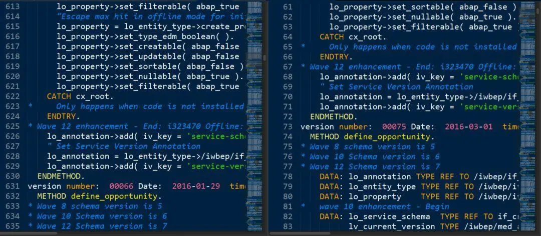 有了这个本地文件,我可以用文本编辑器同时打开它两次,然后可以通过鼠标滑动的方式,快捷地比较任意两个版本的差异,而不需要SAPGUI"选择待比较的版本->点击比较按钮->查看比较结果->点回退按钮->选择下一组要比较的版本"这种笨拙的操作,工作效率得到质的提升。