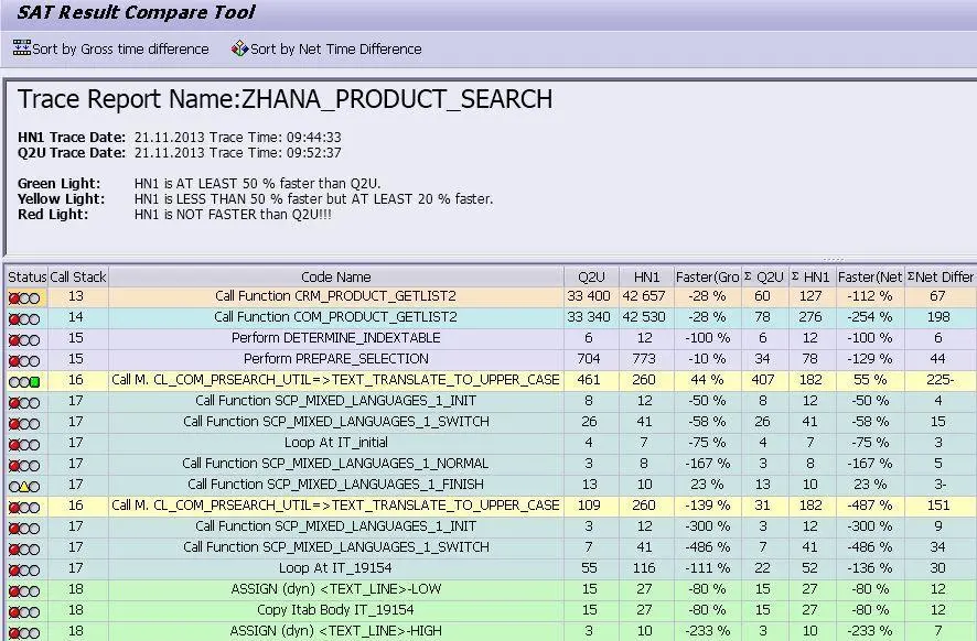 当时,德国同事给我们的要求就是,在两个系统分别用SAT运行应用,然后手动分析SAT结果,把在数据库为HANA的系统上运行速度慢于非HANA系统的点都找出来,写成文档。
