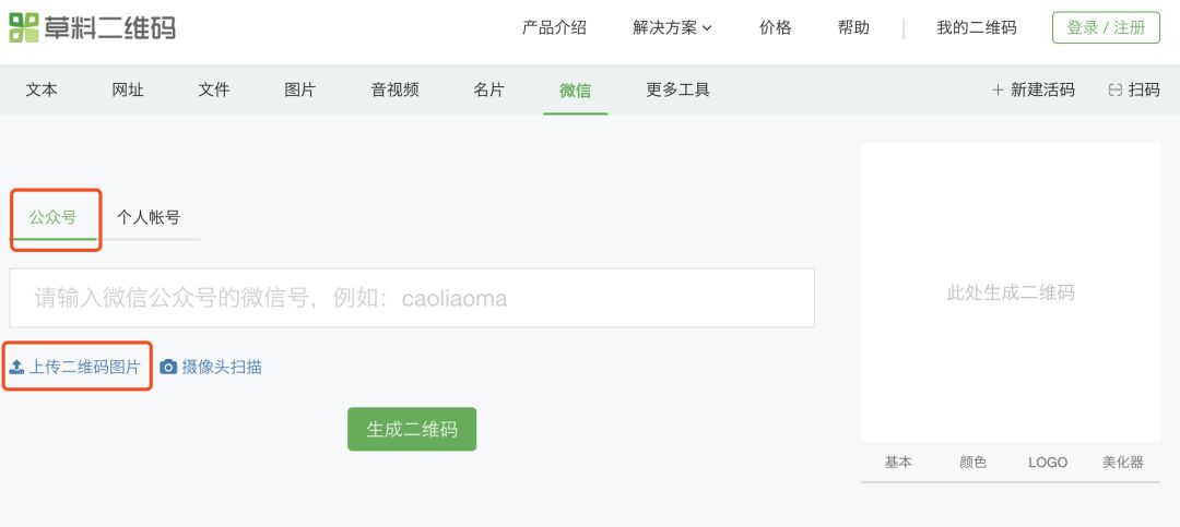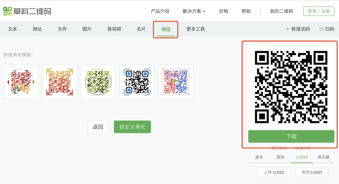 对了有人可能会发现微信二维码下载下来是带logo的,怎样才能生成不带logo的二维码呢?这里推荐大家使用草料二维码: https://cli.im/weixin。