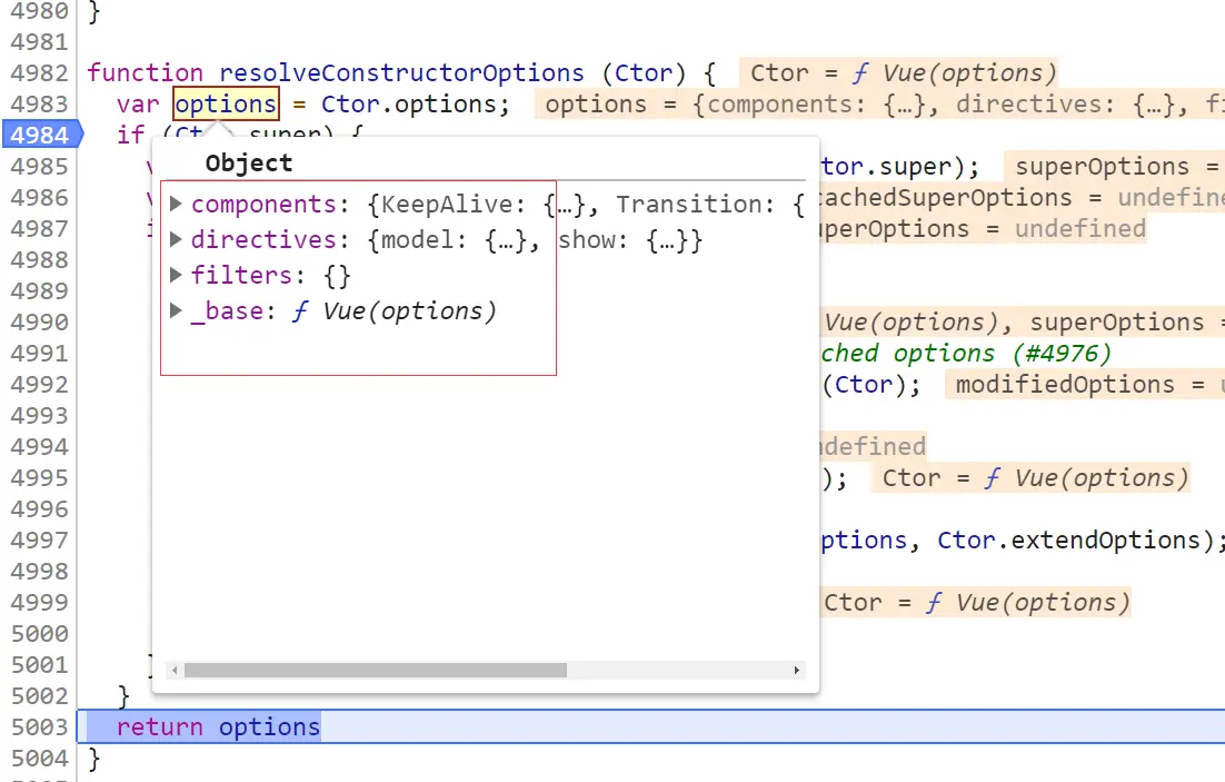 上面我们知道Ctor就是Vue构造函数,他是没有super属性的,所以这里就先返回了options.但是这里你调用debugger可以看到Ctors.options有属性的,什么时候加上的呢?这个要等我们调用initGlobalAPI 才知道。