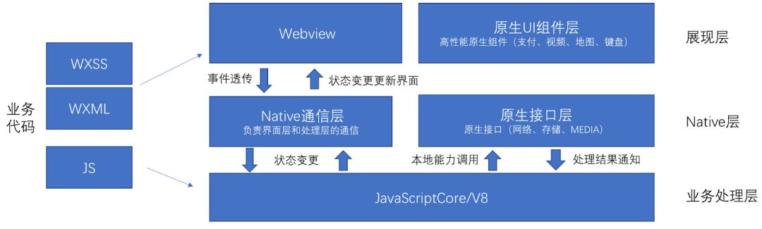小程序展现层使用 Webview,里面内置了一套 JS 框架用来和 Native 通信,真正业务代码执行在单独 JS 虚拟机容器实例中