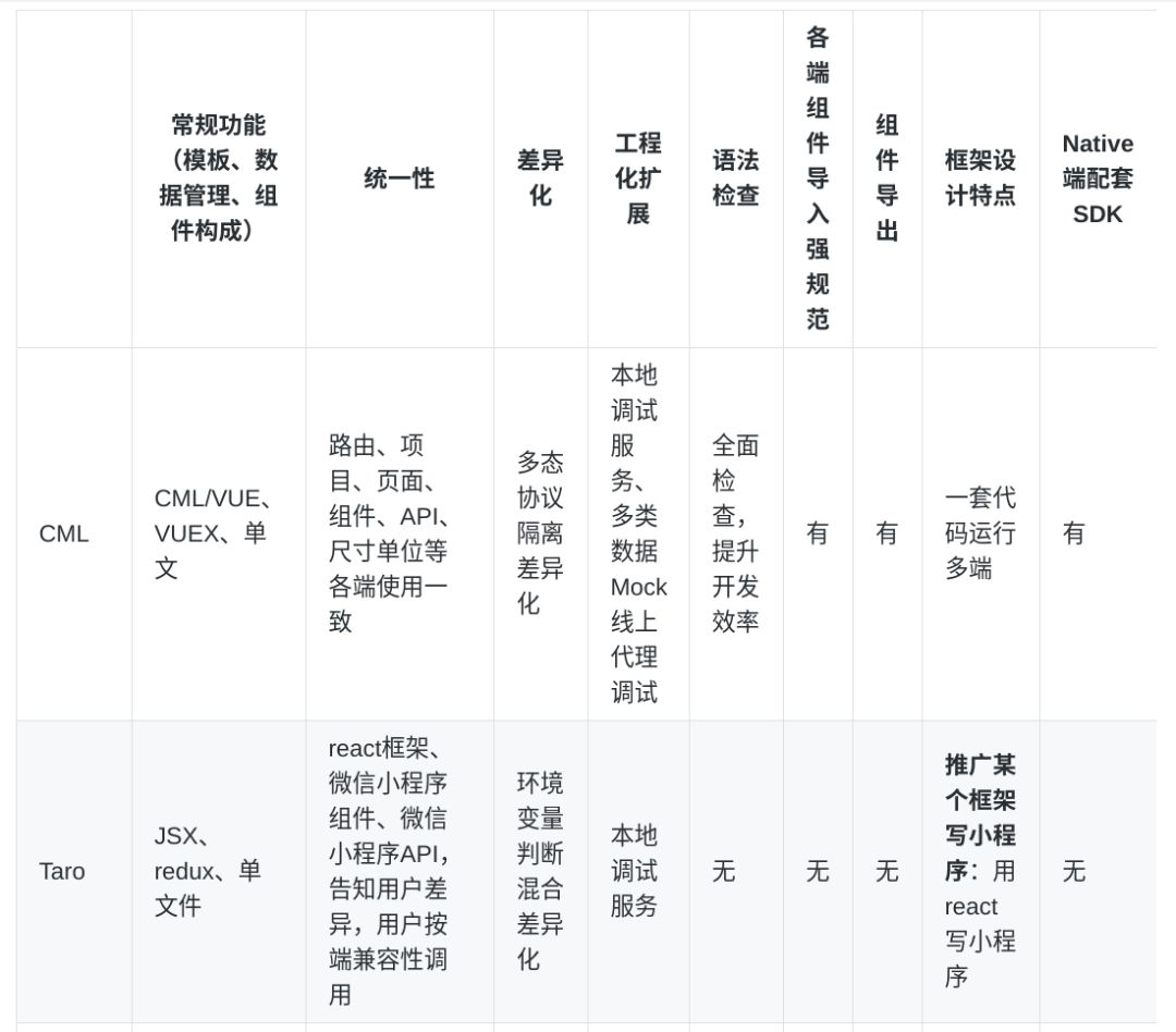 表中每一项都是在做跨端方案时需要考虑到的。我们说除了 Chameleon,其它方案都只是在对小程序进行增强,或者说是模仿微信小程序的 API 和组件的接口设计。