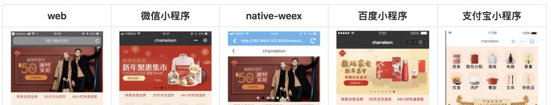 我们觉得 Chameleon 与其它解决方案的最大区别在于其它框架都是小程序增强,即用 Vue 或者 React 写小程序,这些框架官方给的已接入例子也都是跑微信小程序。