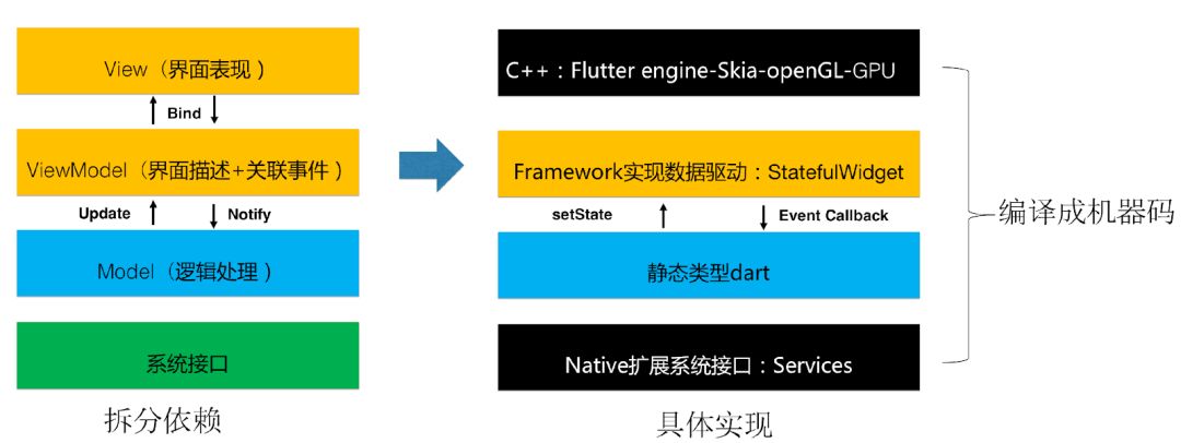 本质上 Flutter 也是 MVVM 架构,逻辑层通过 setState 通知视图层更新,一定程度上这也是为什么 Flutter 敢说能转成 Web 框架的原因,核心还是基于这类数据驱动视图架构模式,业务代码不会深度依赖任何一端特有的“视图模型”。