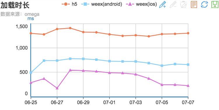 以下是性能方向中的首屏加载时间的优化数据,原有 H5 使用 SSR(Server Side Render)已经算是最快的 Web 首屏技术方案了(不考虑优化后端多模块耗时的 BIGPIPE),它保持在 1.5 秒以下,在优化后降到 0.5 秒左右。