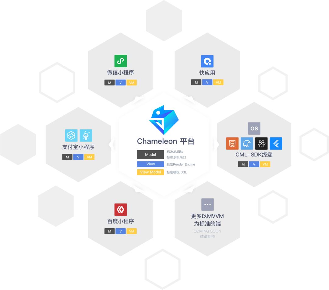 在 MPV 的实践积累下,有了一定的底气和把握,后续的规划更加明确。2018 年 4 月我们把跨端项目规模进一步扩大,想要做一个真正跨 N 端的解决方案,目标是提供标准的 MVVM 架构开发模式统一各类终端。这就是 Chameleon 的出现契机。