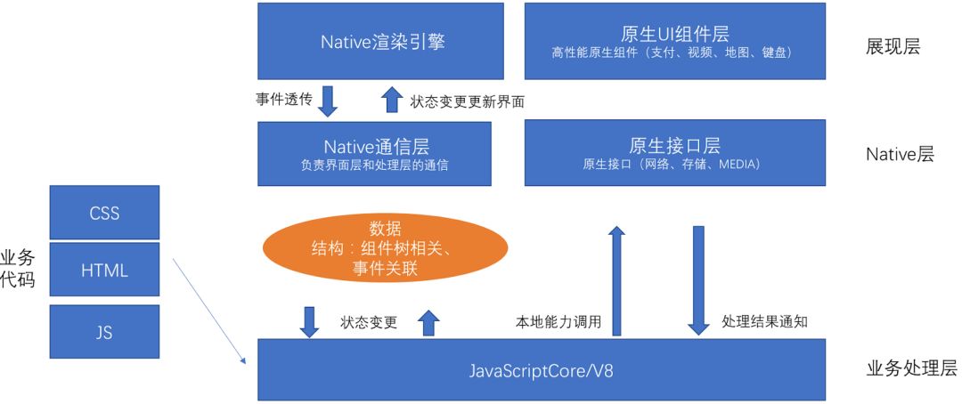 开发者编写的代码在虚拟机(V8、JavaScriptCore)里面运行,虚拟机容器里面包含扩展的系统基础接口。运行时,将描述界面的数据(主要是 CSS+DSL 所描述内容)通过通信层传递给 Android、iOS 端的渲染引擎,用户触摸界面时,通过通信层传递给虚拟机里面的业务处理代码,业务处理代码可能调用网络、储存与媒体等接口,最后再次反馈到界面。