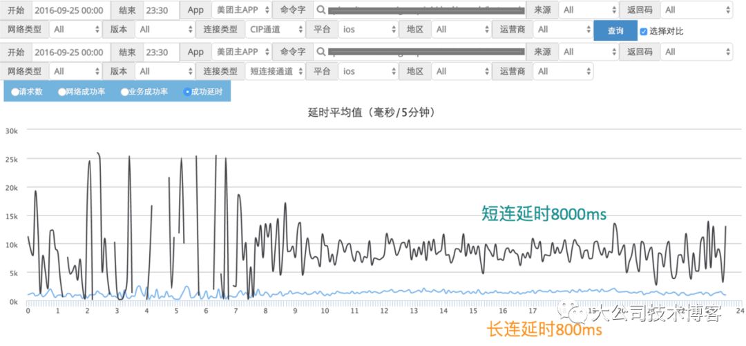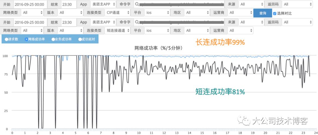 上面两张图片对比了长 / 短连接的成功率和网络延时数据,这两个是网络模块最重要的衡量指标。可以看出,无论是成功率,还是网络延时,长连接都明显优于短连接。