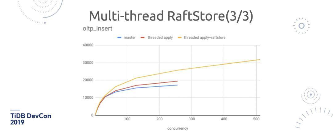 通过上图大家可以看到,随着并发不断加大,写入是能够去线性扩展的。在早期版本中,并发到一定程度的时候,RaftStore 也会成为瓶颈,那么为什么我们之前没有做这个事情?这个优化效果这么明显,之所以之前没有做,是因为之前 Raft 这块很多时候不会成为瓶颈,而在其他地方会成为瓶颈,比如说 RocksDB 的写入或者 gRPC 可能会成为瓶颈,然后我们将 RaftStore 中的功能不断的向外拆,拆到其他线程中,或者是其他线程里面做多线程,做异步等等,随着我们的优化不断深入,用户场景下的数据量、吞吐量不断加大,我们发现 RaftStore 线程已经成为需要优化的一个点,所以我们在 3.0 中做了这个事情。而且之前保持单线程也是因为单线程简单,「先把事情做对,然后再做快」。