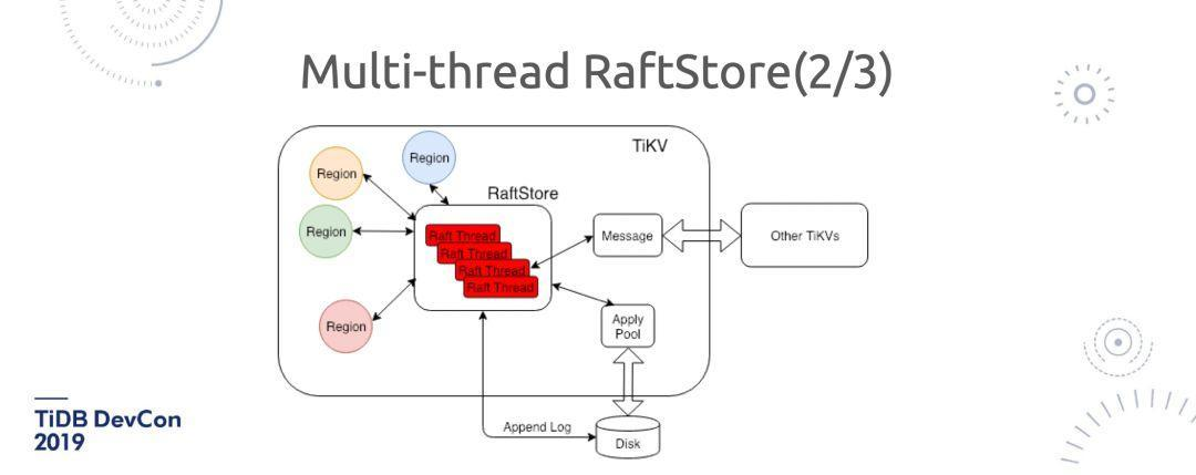 因此在 TiDB 3.0 中做了一个比较大的改进,就是将 RaftStore 这个线程,由一个线程变成一个线程池, TiKV 上所有 Raft Peer 的 Raft 状态机驱动都由线程池来做,这样就能够充分利用 CPU,充分利用多核,在 Region 特别多以及写入量特别大的时候,依然能线性的提升吞吐。