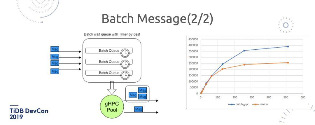 所以我们在 TiDB 3.0 Beta 中设计了 Batch Message 。以前是一个一个消息的发,现在是按照消息的目标分队列,每个队列会有一个 Timer,当消息凑到一定个数,或者是你的 Timer 到了时间(现在应该设置的是 1ms,Batch 和这个 Timer 数量都可以调),才会将发给同一个目的地的一组消息,打成一个包,一起发过去。有了这个架构上的调整之后,我们就获得了性能上的提升。