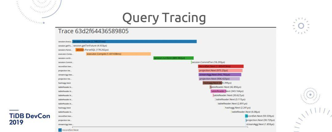所以我们又做了一个叫 Query Tracing 的东西,其实在 TiDB 2.1 之前我们已经做了一部分,在 TiDB 3.0 Beta 中做了一个收尾,就是我们可以将 Explain 结果转成一种 Tracing 格式,再通过图形化界面,把这个 Tracing 的内容展示出来,就可以看到这个算子具体干了一些什么事,每一步的消耗到底在哪里,这样就可以知道哪里有问题了。希望大家都能在 TiDB 3.0 的版本中非常直观的定位到 Query 慢的原因。