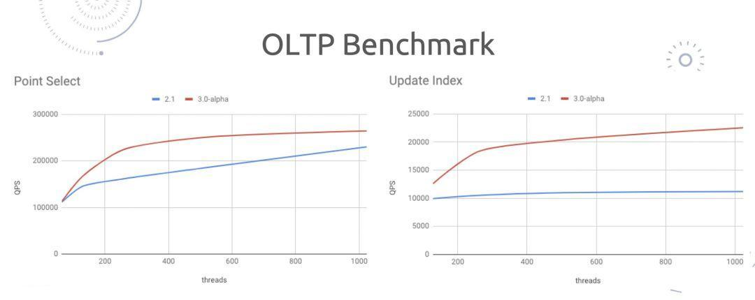 从图 18 中可以看到,我们对 TiDB 3.0 Beta 中做了这么多性能优化之后,在 OLTP 这块进步还是比较大的,比如在 SysBench 下,无论是纯读取还是写入,还是读加写,都有几倍的提升。在解决稳定性这个问题之后,我们在性能方面会投入更多的精力。因为很多时候不能把「性能」单纯的当作性能来看,很多时候慢了,可能业务就挂了,慢了就是错误。