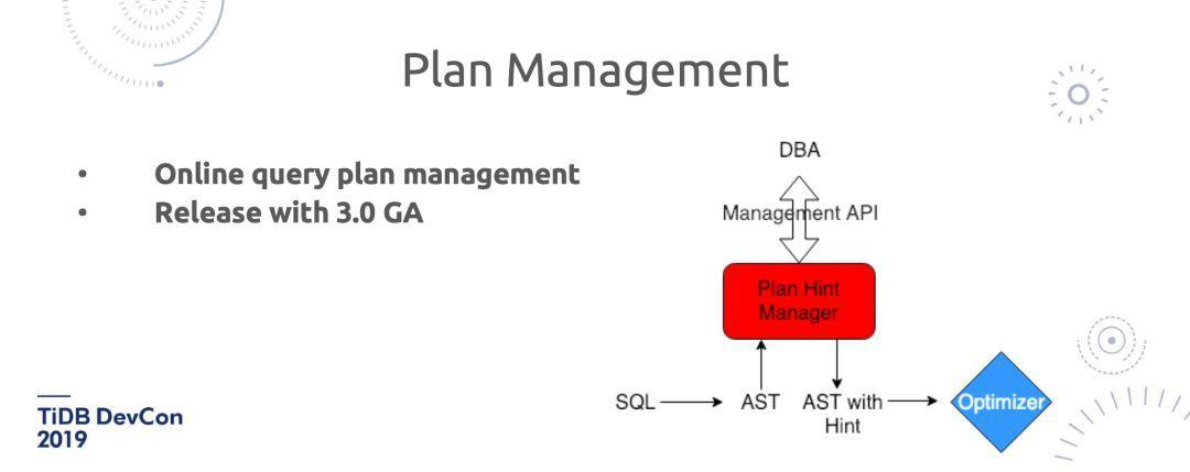 然后第二点 Plan Management 其实也是为了 Plan 不稳定这个问题做准备的。虽然我们希望数据库能自己 100% 把 Plan 选对,但是这个是非常美好的愿望,应该还没有任何一个数据库能保证自己能 100% 的解决这个问题。那么在以前的版本中,出现问题怎么办?一种是去 Analyze 一下,很多情况下他会变好,或者说你打开自动 Analyze 这个特性,或者自动 FeedBack 这个特性,可以一定程度上变好,但是还可能过一阵统计信息又落后了,又不准了,Plan 又错了,或者由于现在 cost 模型的问题,有一些 Corner Case 处理不到,导致即使统计信息是准确的, Plan 也选不对。