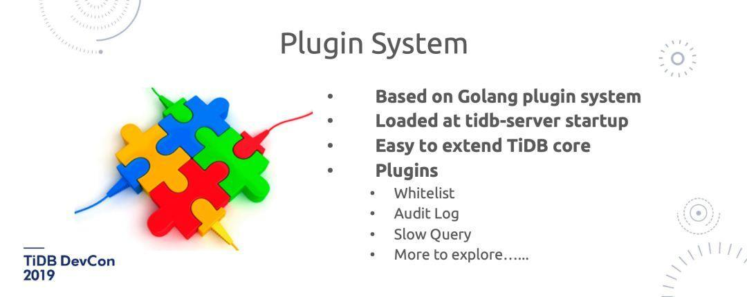 我们现在做了一个插件系统,因为我们发现数据库能做的功能太多了,只有我们来做其实不太可能,而且每个用户有不一样的需求,比如说这家想要一个能够结合他们的监控系统的一个模块,那家想要一个能够结合他们的认证系统做一个模块,所以我们希望有一个扩展的机制,让大家都有机会能够在一个通用的数据库内核上去定制自己想要的特性。这个插件是基于 Golang 的 Plugin 系统。如果大家有 TiDB Server 的 Binary 和自己插件的 .so,就能在启动 TiDB Server 时加载自己的插件,获得自己定制的功能。
