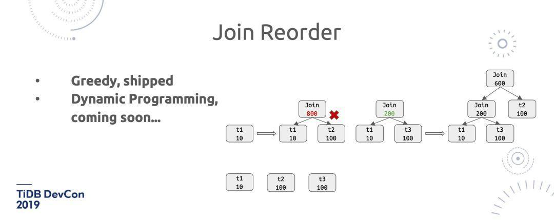 我们接下来还要再做一个基于动态规划的 Join Reorder 算法,很有可能会在 3.0 GA 中对外提供。 在 Join 表比较少的时候,我们用动态规划算法能保证找到最好的一个 Join 的路径,但是如果表非常多,比如大于十几个表,那可能会选择贪心的算法,因为 Join Reorder 还是比较耗时的。