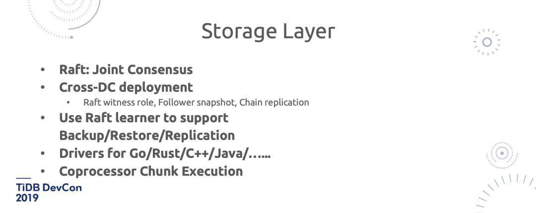 比如在存储引擎层,我们对 Raft 层还在改进,比如说刚才我提到了我们有 Raft Learner,我们已经能够极大的减少由于调度带来的 Raft Group 不可用的概率,但是把一个 Learner 提成 Voter 再把另一个 Voter 干掉的时间间隔虽然比较短,但时间间隔依然存在,所以也并不是一个 100% 安全的方案。因此我们做了 Raft Joint Consensus。以前成员变更只能一个一个来:先把 Learner 提成 Voter,再把另一个 Voter 干掉。但有了 Raft Joint Consensus 之后,就能在一次操作中执行多个 ConfChange,从而把因为调度导致的 Region 不可用的概率降为零。