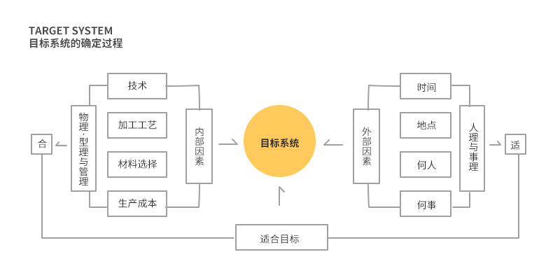 上文说过设计就发生在内部因素和外部因素的“关系”中,而这其中的“关系”其实就是适应的过程,设计还可以理解为是以一定的目的、一定的方式来达到与客观条件内部关系相适应的人为适应系统。设计的内部因素、外部因素和设计目的是设计过程中应当遵守的具体内容。