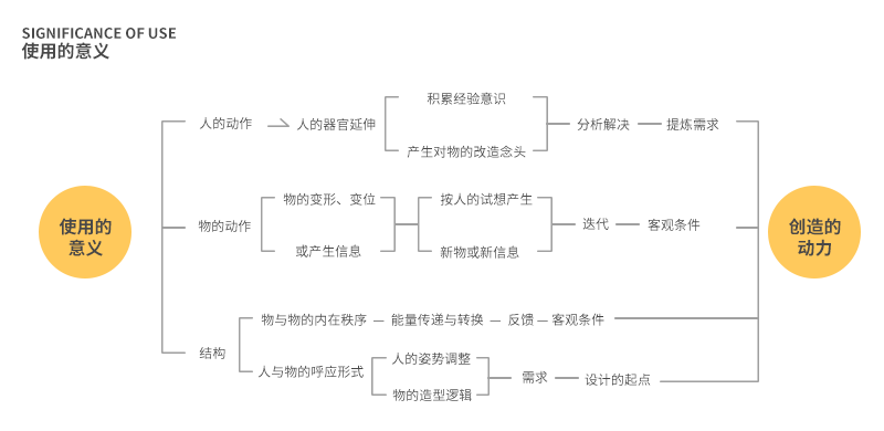 在“使用”物品的过程其实包含两个方面,一是使用者——人的动作:二是被使用者——物的动作。人的动作是人生理结构和生存需要指示下的延伸,在动作的引导下人的大脑对外界的刺激作出反应,留下印象,形成经验,储存信息,成为意识。当再次遇到类似的问题是,人会逐渐总结经验并形成知识的迁移。物的动作是人使用过程中人的动作在物上的反应,这就包括器物的变形、移动、或是其他信息(比如声音,灯光等等)。