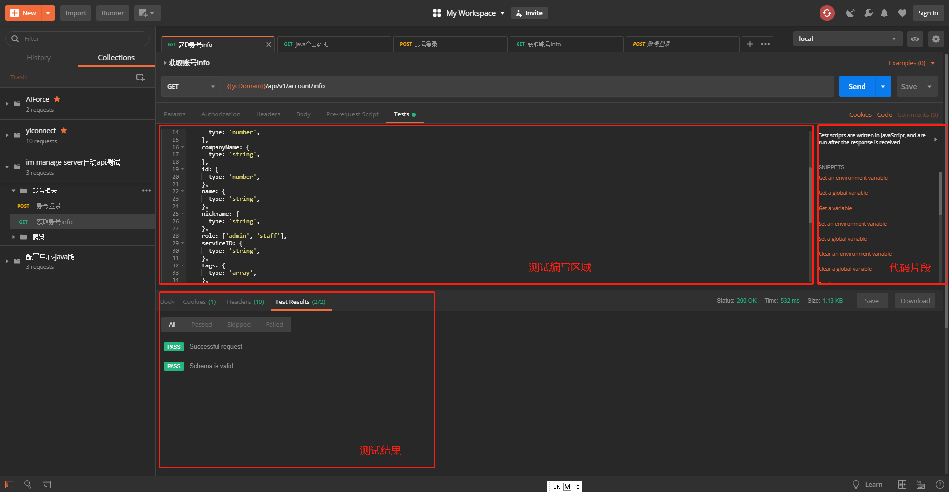 Test Resultstab可以看到对应的测试结果。另外为了可以快速编写测试脚本,postman提供了一些通用的代码片段(code snippets)。如下是对应的功能结构图: