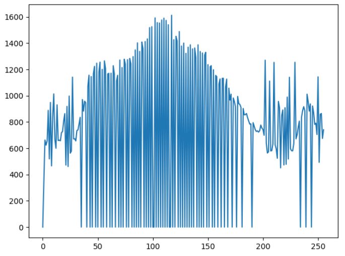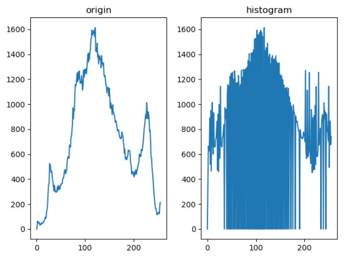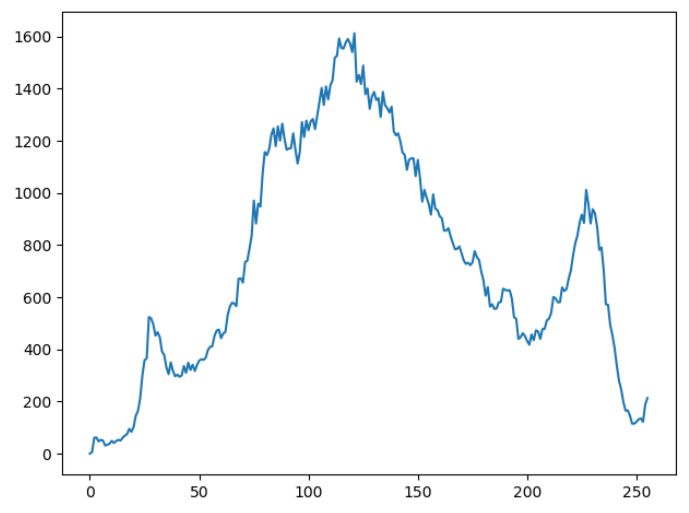 1def histogram(gray):2 hist = cv2.calcHist([gray], [0], None, [256], [0.0, 255.0])3 plt.plot(range(len(hist)), hist)4# opencv calcHist函数传入5个参数:5# images:图像6# channels:通道7# mask:图像掩码,可以填写None8# hisSize:灰度数目9# ranges:回复分布区间