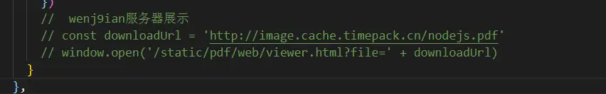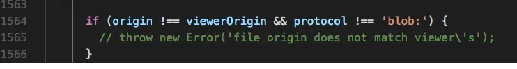 ps:pdf.js是不支持跨域文件加载的 直接加载是不会成功的。会报 “file origin doesnot match viewer”错误。 所以我们得改变一下源码: ==>> 注销 viewer.js 的1565行即可
