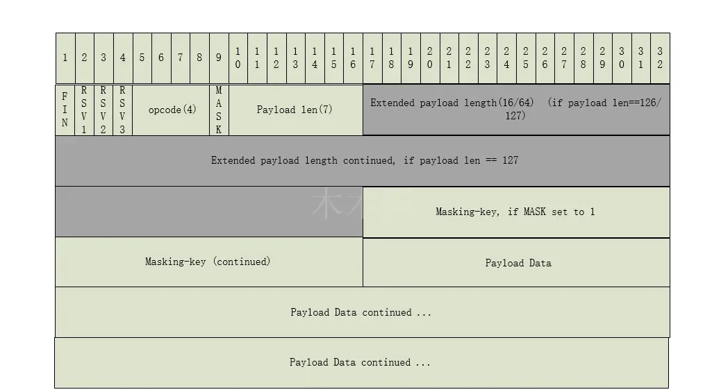 Opcode: 4 bit,操作码,如果收到一个未知的操作码,接收终端必须断开WebSocket连接。