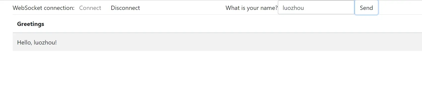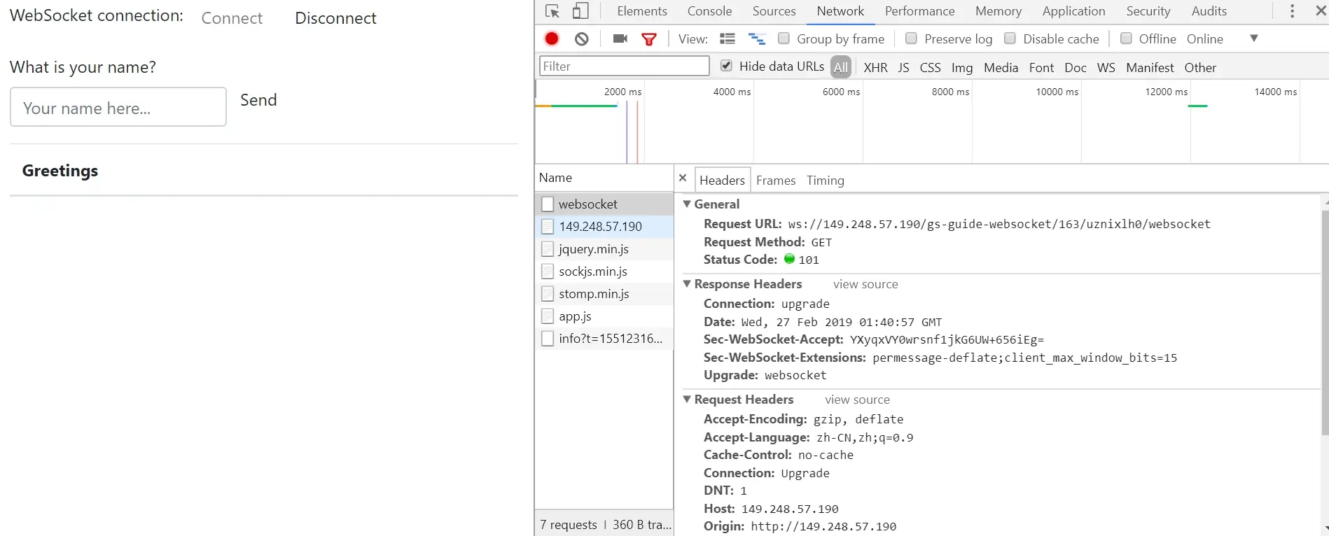 页面提供连接与断开功能,输入自己的名字发送,服务端返回Hello,名字!功能很简单,我们先看看页面的请求和响应。