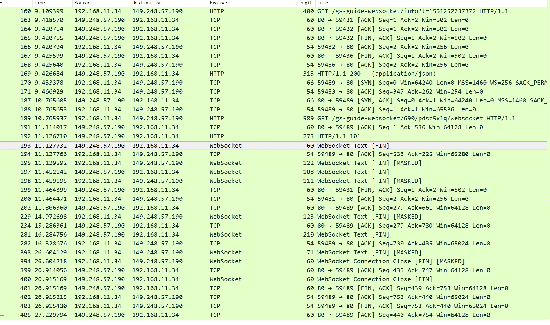 我们根据截图可以知道,B请求对应的响应是序号 192 的数据,返回码是101,根据 HTTP 返回码我们可以知道,服务器已经理解了客户端的请求,并将通过Upgrade 消息头通知客户端采用不同的协议来完成这个请求。在发送完这个响应最后的空行后,服务器将会切换到在 Upgrade 消息头中定义的那些协议,也就是升级为 WebSocket 协议。所以接着193的包已经变成了 WebSocket 协议了。到这里,WebSocket 的握手连接就已经完成了。