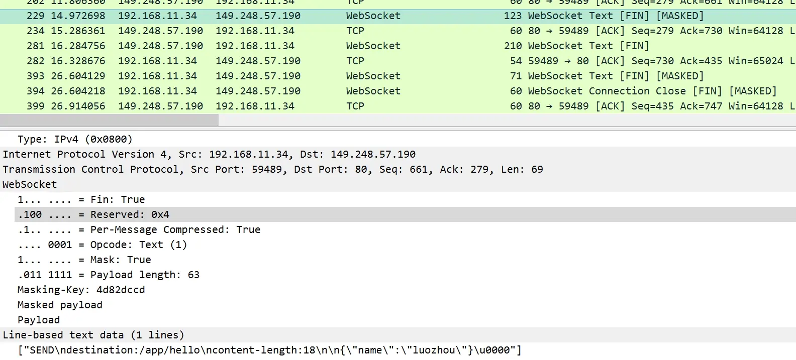 根据上图我们发现 序号229的包是一个文本类型的包,opcode:1,然后采用了掩码处理,同时是最后一个处理包。我们仔细发现所有客户端发送服务端的包都会有[MASKED]标记,服务端返回的没有,这就说明了从客户端向服务端发送数据时,需要对数据进行掩码操作;从服务端向客户端发送数据时,不需要对数据进行掩码操作。
