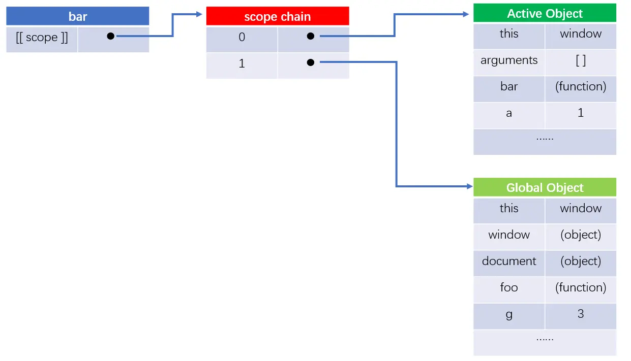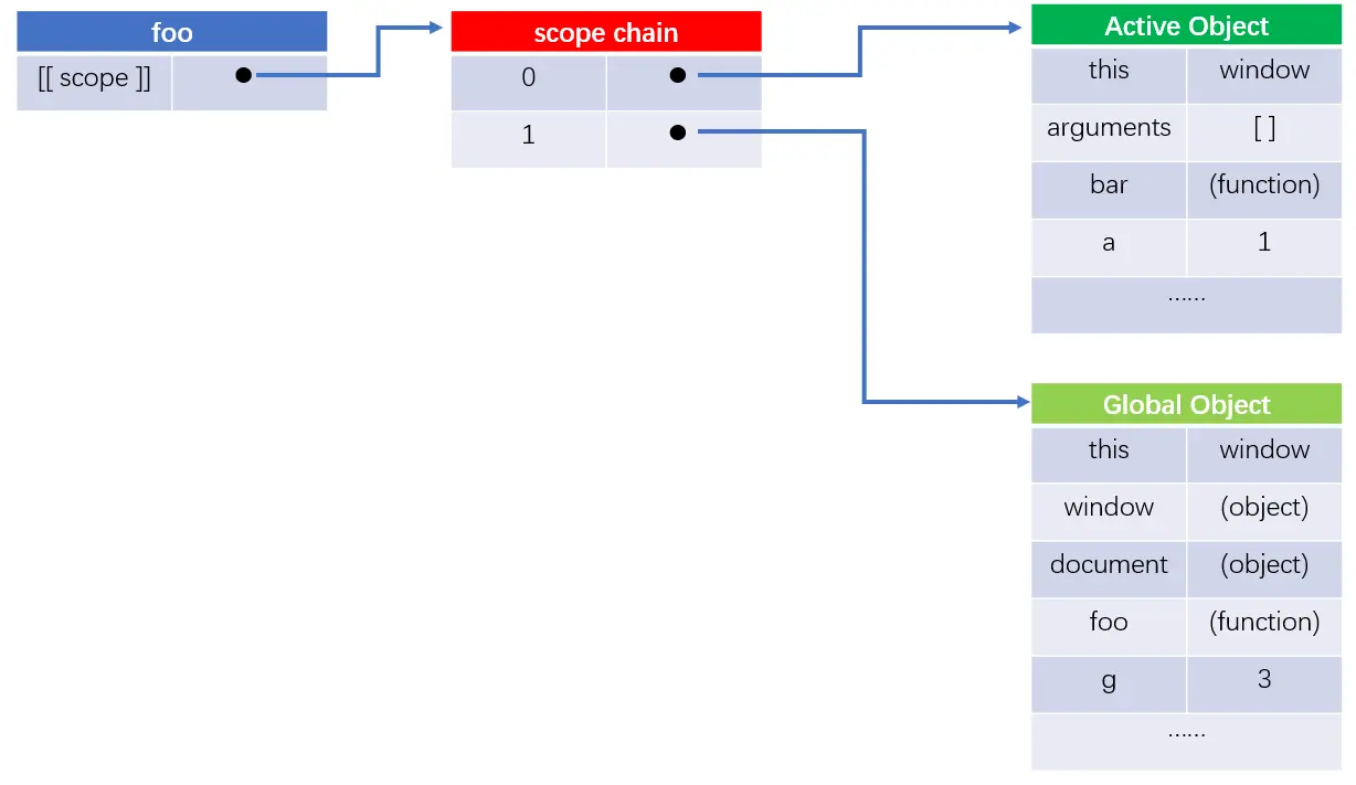 - 3. foo函数在被编译的同时也创建了bar函数,所以bar函数也会自动赋予[ [ scope ] ]属性,又应为它是foo的内部函数,所以它的作用域链与foo函数在执行时的一样