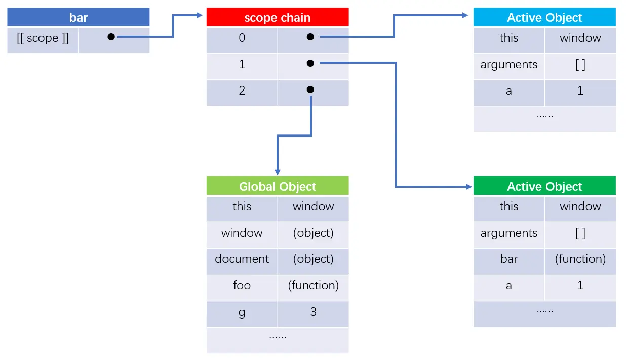 - 6.通过上面bar函数执行时的作用域链我们可以看到,如果编译器需要去寻找全局变量g,那么它将会从其作用域链上一层一层往上寻找,即从scope chain集合0开始,一直寻找到最后一个2,即全局对象GO,假如没有找到那么就会报错了
