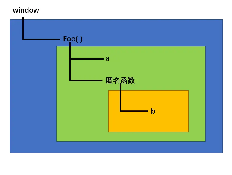 当我们调用一条数据的时候,JavaScript首先会在当前作用域中进行查找,如果找不到,就向上找到父级的作用域,如果在父级的作用域中也找不到,就继续向上查找,直到window的作用域。如果在window中也找不到,就报错了,这种查找规则就是建立在JavaScript的作用链上的。下图画出了我们刚才闭包示例代码中的作用域链 ,其中每种颜色都是一种执行环境也就是作用作用域链与闭包的关系