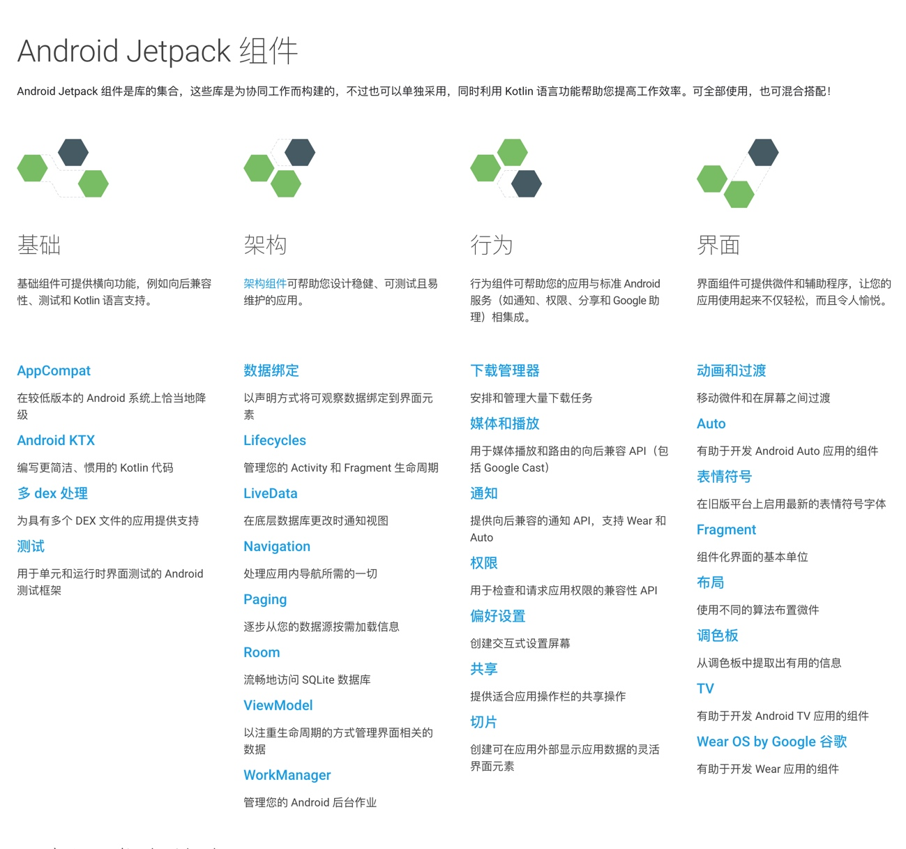2018 年的 Google I/O 大会上,Google 发布了 Android Jetpack,并称其为下一代的 Android 组件,旨在帮助开发者加快应用开发速度。准确来讲,Jetpack 是一系列 Android 软件组件的集合,它包括基础组件、架构组件、行为组件、界面组件。其中的 Android Architecture Components 指的就是这里的 “架构组件”。