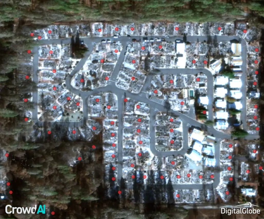 在此次火灾中,从卫星图像中识别出结构后,根据受灾前后的图像对比, AI 模型用红点标识出损坏所在的位置。