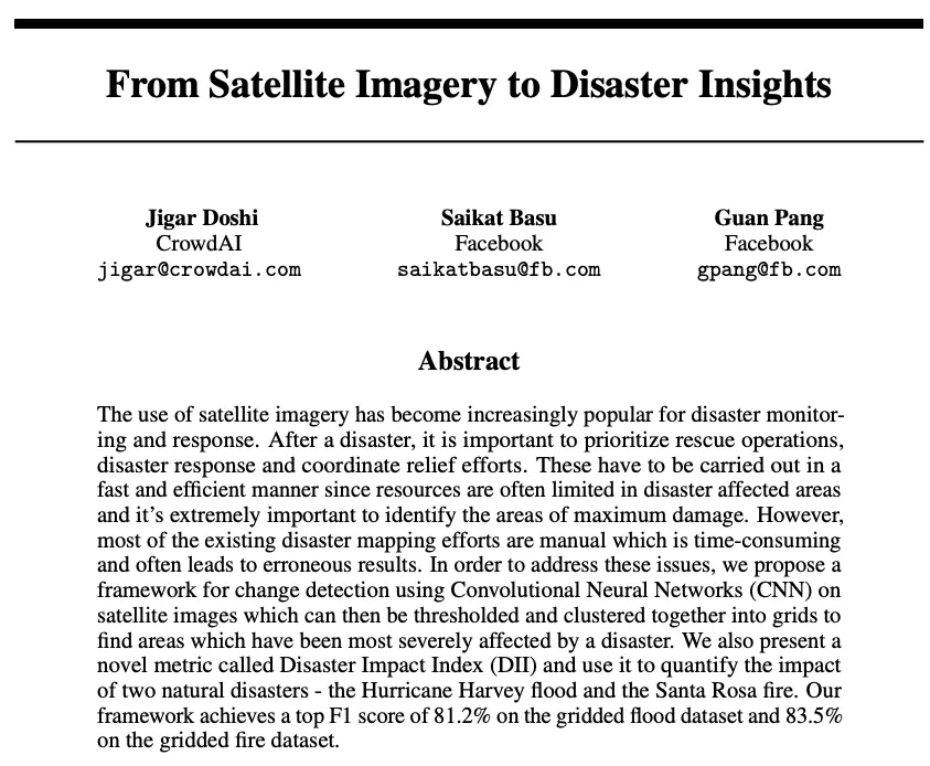 CrowdAI 还与 Facebook AI 进行过合作,研究飓风和火灾造成损失的评估工作。他们的研究成果《From Satellite Imagery to Disaster Insights》也被 NeurIPS 会议所接受。