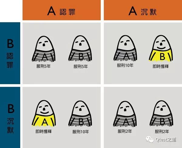 要说起测试人员和开发人员之间的博弈,有一个特别具有代表性的例子—囚徒困境。此故事讲的是,两个嫌疑犯作案后被警察抓住,分别关在不同房间里审讯。警察知道二人有罪,但是缺乏足够的证据。因此警察告诉二人:“如果两人都沉默,各判刑2年;如果两人都认罪,各判刑5年;如果出卖同伴,自己获得自由,对方判刑10年。”于是,每个囚徒都面临两种选择:认罪或沉默。从自身利益考虑,认罪比沉默的好。但就如下图所示,两个人互相出卖,他们的结果就是一起服刑5年。但如果两人从整体利益出发、为对方考虑下,两人都沉默各判刑2年,显然这个结果才是对大家最好的。