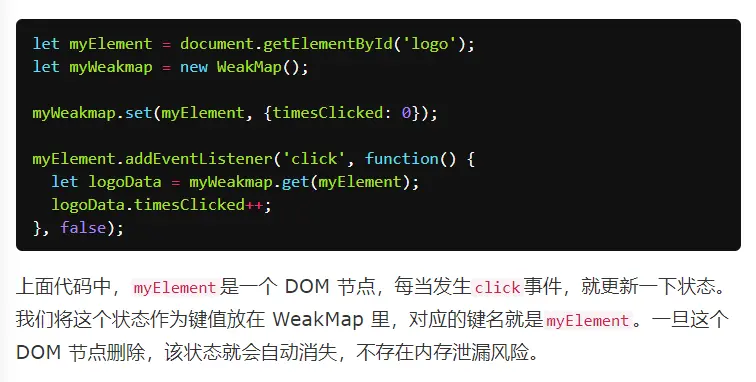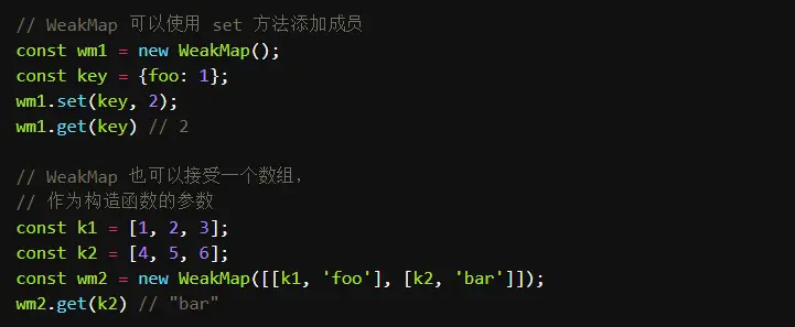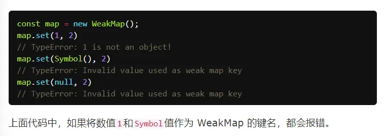 - WeakMap 结构与 Map 结构基本类似,唯一的区别是它只接受对象作为键名(null除外),不接受其他类型的值作为键名,而且键名所指向的对象不计入垃圾回收机制