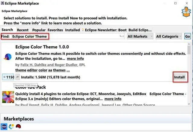 在搜索框里输入Eclipse Color Theme,点Go,马上就得到搜索结果。点Install安装:
