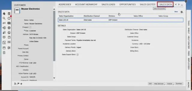 ERP的Sales Area数据出现在C4C TI page的Sales data标签页: