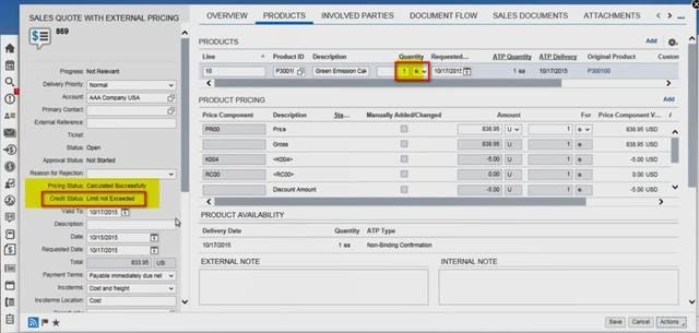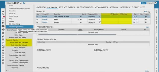 执行action "Request External Pricing"会从ERP更新pricing信息,触发ATP检查: