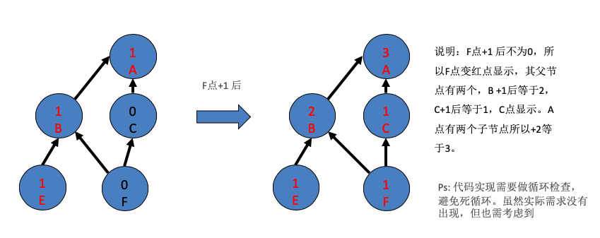 实现算法:只有子节点可主动设置数据变化,当一个个子节点的数据发生变化,需要通知父节点重新计算点数,计算方法为将所有子节点点数相加,然后递归触发父节点计算方法,向上刷新数据。父节点可以做清零操作,即把所有子节点点数置0,向下递归清零,并且向上递归计算点数。下图是一个例子